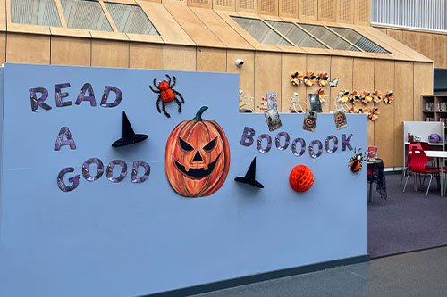 October saw the Reading Hub at Archbishop Beck transformed for a themed Halloween month, creating a buzz of excitement and curiosity among pupils. Cobwebs, pumpkins and shadowy silhouettes set the scene, while displays of carefully chosen “spooky” books invited readers to explore mysterious mansions, daring adventures and spine-tingling tales. The themed space encouraged pupils to step outside their usual reading choices, with books grouped by theme to make browsing irresistible and ensuring that all age groups felt confident to join in.
